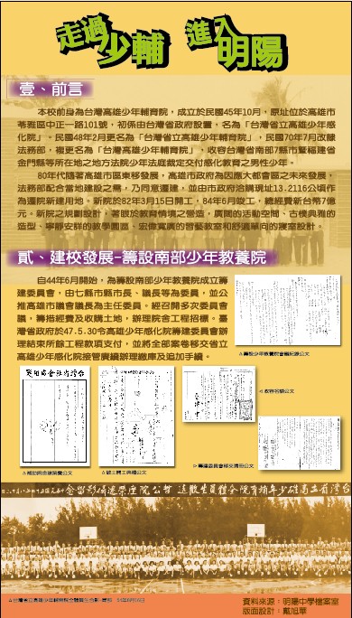 建校發展:明陽中學前身自45年10月成立台灣省立高雄少年感化院,48年2月更名為台灣省立高雄少年輔育院,70年7月改隸法務部,名為台灣高雄少年輔育院,至88年7月改制為少年矯正學校-明陽中學為止之檔案海報展示。