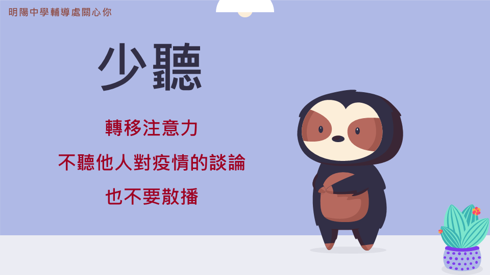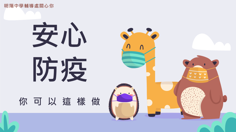 因應嚴峻的疫情,學校已經採取了各種防疫措施,讓病毒傳播的可能性降到最低。對於疫情的擴大,直接影響了大家的生活,輔導處設計了安心防疫文宣,幫助出校生以及家屬在疫情的衝擊下,面對經濟、生活模式與步驟的劇變,回到身心的平衡,彼此陪伴,走過這段特別的時期。